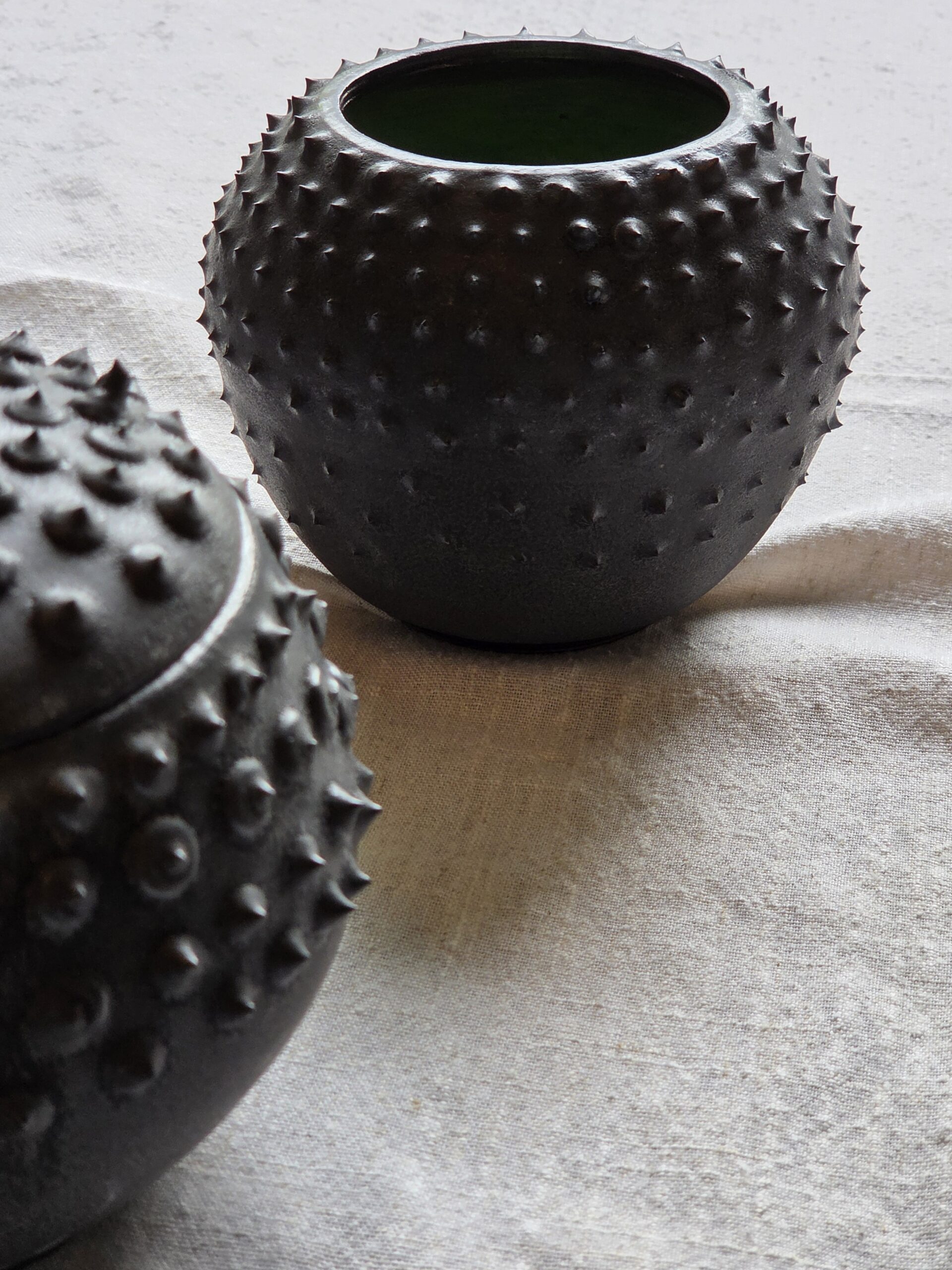 I really like the feeling of these. Gothic in a way and real sharp to the touch. Glazed with a matte black glaze that remind you of cast iron.