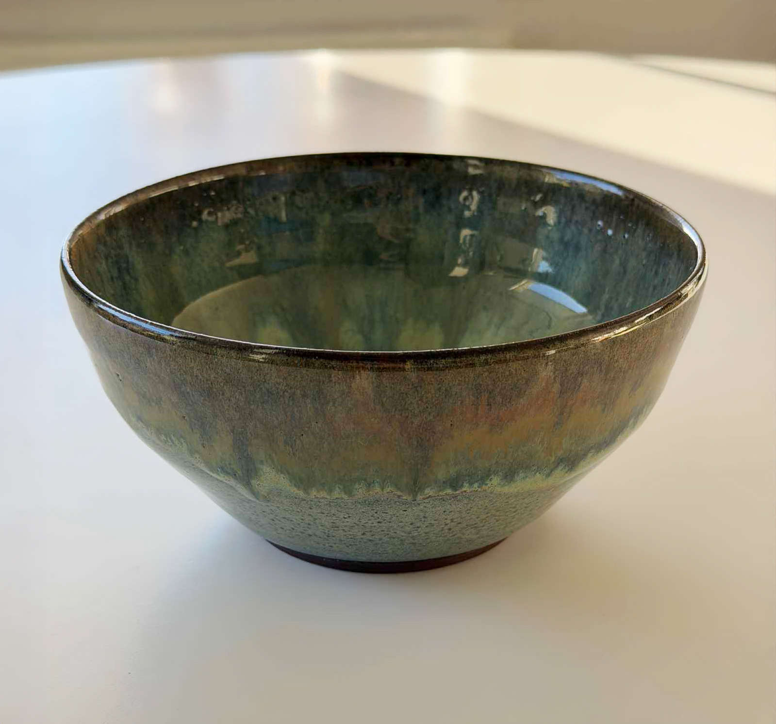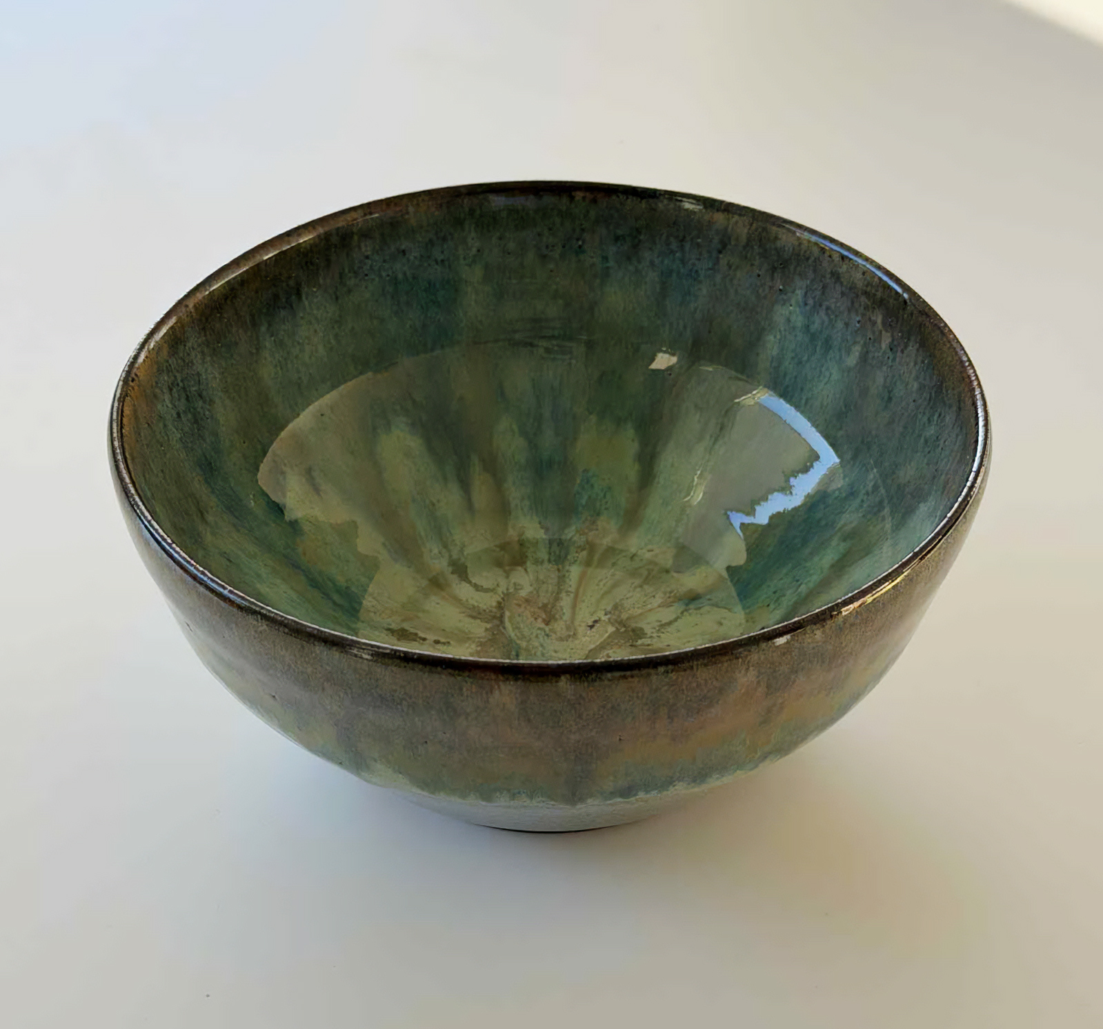 The Forest Glade Bowl has soft green and brown tones that blend together like light through trees. The glaze created some nice natural variations inside, making each angle a bit different. It’s a calm, grounded piece that works well for everyday use or as a decorative bowl.