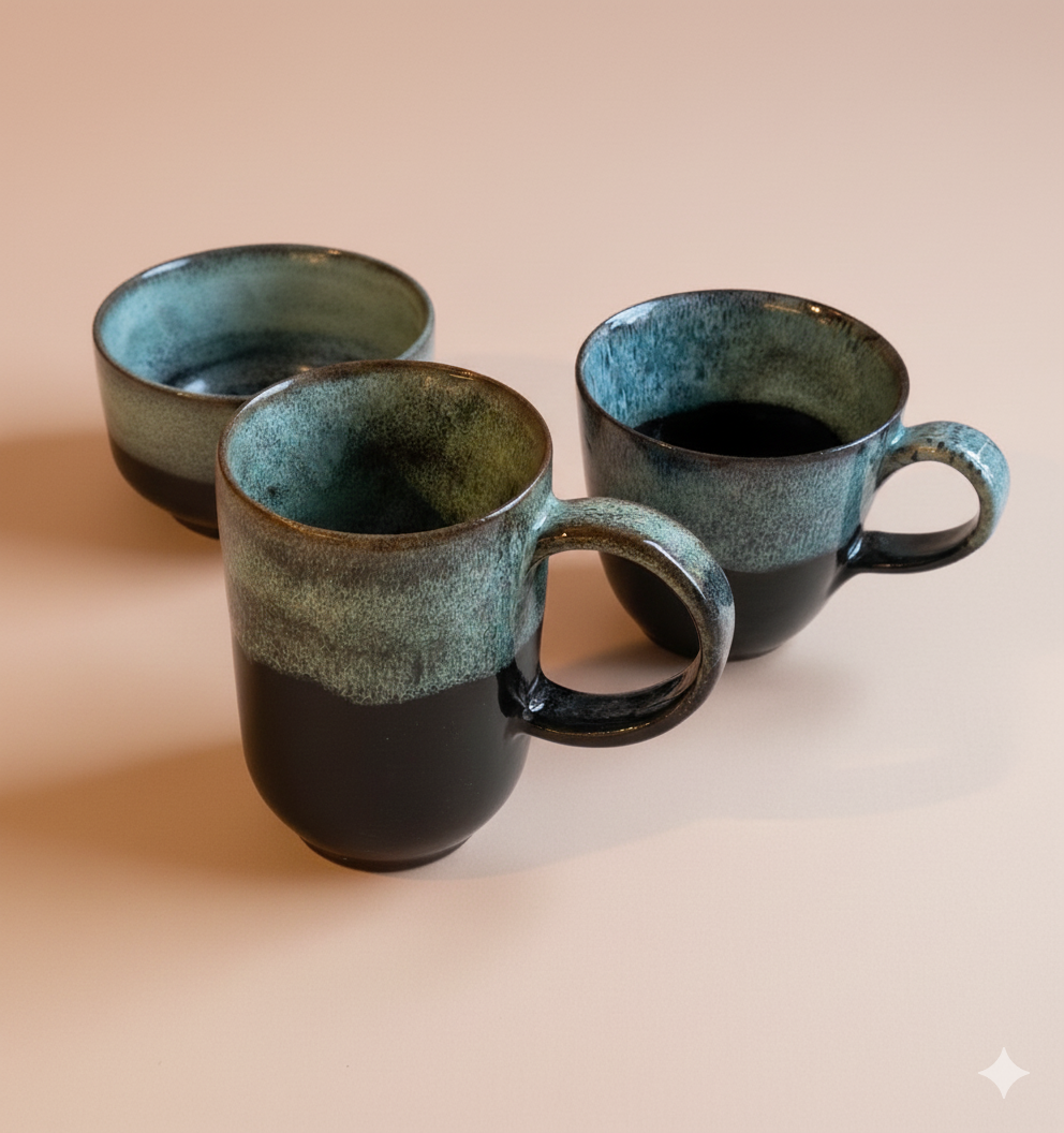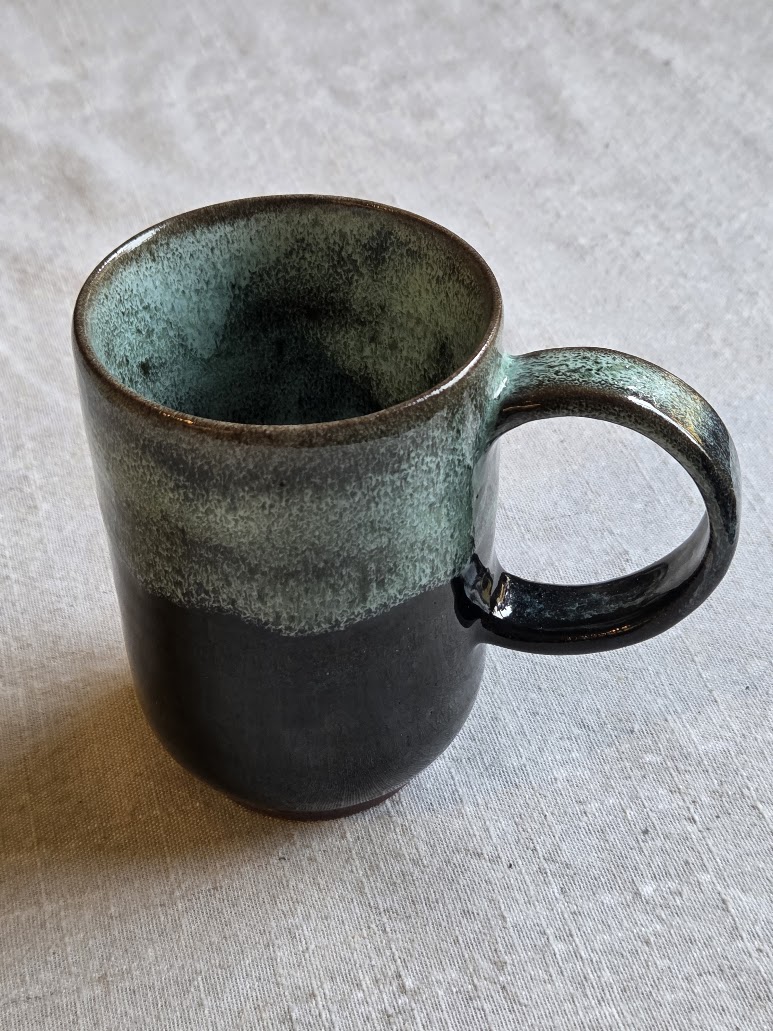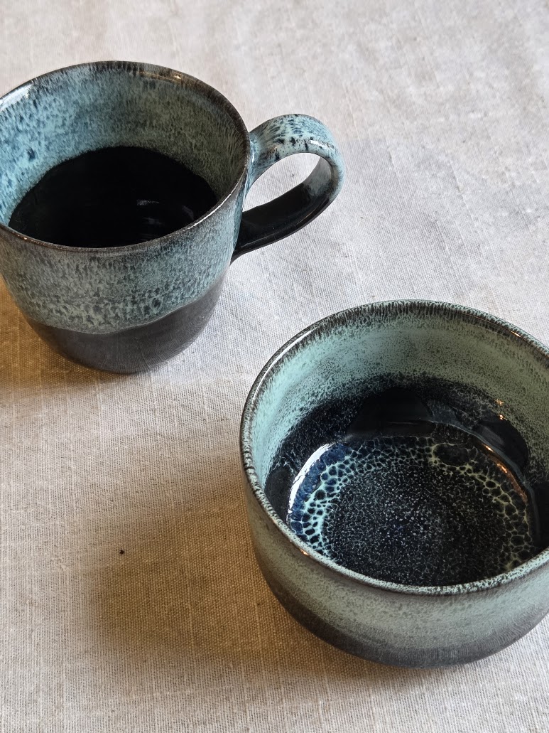 Diffrently shaped mugs with a glaze the reminds you of a midvinter snow storm.